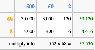 Below is an illustration showing you how to calculate 552 times 68 using the box method, using the instructions above.