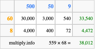 Below is an illustration showing you how to calculate 559 times 68 using the box method, using the instructions above.