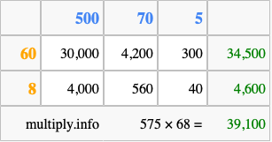 Below is an illustration showing you how to calculate 575 times 68 using the box method, using the instructions above.