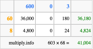 That's all there is to it! As you can see from the box above, the answer to 603 times 68 using the box method is 41,004.