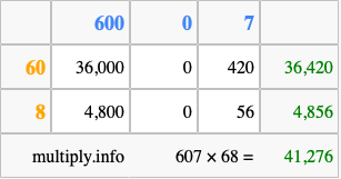 That's all there is to it! As you can see from the box above, the answer to 607 times 68 using the box method is 41,276.