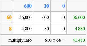 That's all there is to it! As you can see from the box above, the answer to 610 times 68 using the box method is 41,480.
