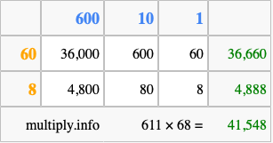 That's all there is to it! As you can see from the box above, the answer to 611 times 68 using the box method is 41,548.
