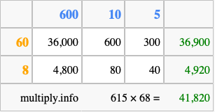Finally, we add up all the sums we found in step 3 to get our final answer to 615 times 68.