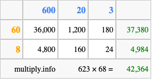 That's all there is to it! As you can see from the box above, the answer to 623 times 68 using the box method is 42,364.
