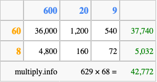Below is an illustration showing you how to calculate 629 times 68 using the box method, using the instructions above.