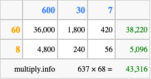 That's all there is to it! As you can see from the box above, the answer to 637 times 68 using the box method is 43,316.