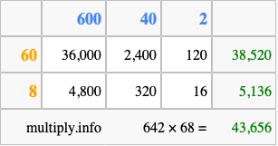 That's all there is to it! As you can see from the box above, the answer to 642 times 68 using the box method is 43,656.