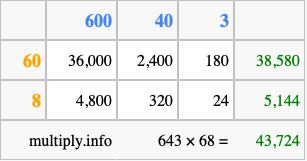 That's all there is to it! As you can see from the box above, the answer to 643 times 68 using the box method is 43,724.