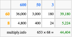 Below is an illustration showing you how to calculate 653 times 68 using the box method, using the instructions above.
