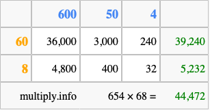 Finally, we add up all the sums we found in step 3 to get our final answer to 654 times 68.