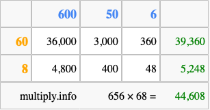 Finally, we add up all the sums we found in step 3 to get our final answer to 656 times 68.