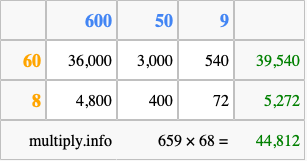 That's all there is to it! As you can see from the box above, the answer to 659 times 68 using the box method is 44,812.