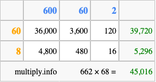 That's all there is to it! As you can see from the box above, the answer to 662 times 68 using the box method is 45,016.
