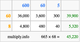 Finally, we add up all the sums we found in step 3 to get our final answer to 665 times 68.