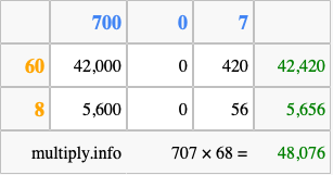 That's all there is to it! As you can see from the box above, the answer to 707 times 68 using the box method is 48,076.