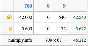 Below is an illustration showing you how to calculate 709 times 68 using the box method, using the instructions above.