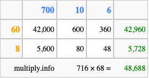 Below is an illustration showing you how to calculate 716 times 68 using the box method, using the instructions above.