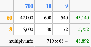 Below is an illustration showing you how to calculate 719 times 68 using the box method, using the instructions above.