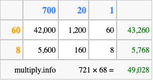 Finally, we add up all the sums we found in step 3 to get our final answer to 721 times 68.