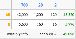 Finally, we add up all the sums we found in step 3 to get our final answer to 722 times 68.