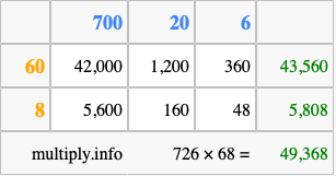 Finally, we add up all the sums we found in step 3 to get our final answer to 726 times 68.