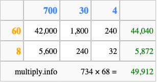 Finally, we add up all the sums we found in step 3 to get our final answer to 734 times 68.