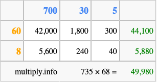 Finally, we add up all the sums we found in step 3 to get our final answer to 735 times 68.