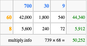 Finally, we add up all the sums we found in step 3 to get our final answer to 739 times 68.