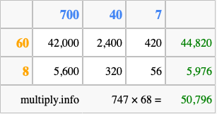 That's all there is to it! As you can see from the box above, the answer to 747 times 68 using the box method is 50,796.