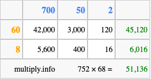 Finally, we add up all the sums we found in step 3 to get our final answer to 752 times 68.