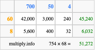 That's all there is to it! As you can see from the box above, the answer to 754 times 68 using the box method is 51,272.