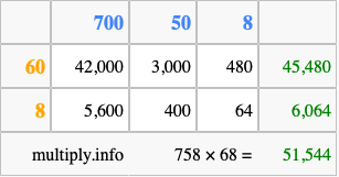 That's all there is to it! As you can see from the box above, the answer to 758 times 68 using the box method is 51,544.