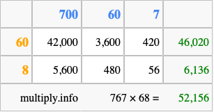 Below is an illustration showing you how to calculate 767 times 68 using the box method, using the instructions above.