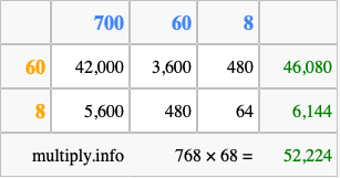 That's all there is to it! As you can see from the box above, the answer to 768 times 68 using the box method is 52,224.