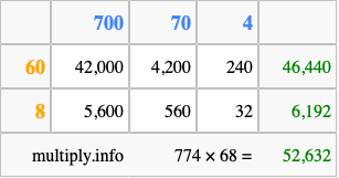 Below is an illustration showing you how to calculate 774 times 68 using the box method, using the instructions above.