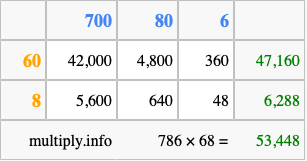 That's all there is to it! As you can see from the box above, the answer to 786 times 68 using the box method is 53,448.