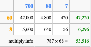 Below is an illustration showing you how to calculate 787 times 68 using the box method, using the instructions above.