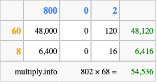 Finally, we add up all the sums we found in step 3 to get our final answer to 802 times 68.