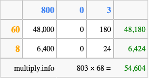 Finally, we add up all the sums we found in step 3 to get our final answer to 803 times 68.
