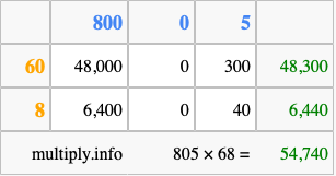 Finally, we add up all the sums we found in step 3 to get our final answer to 805 times 68.