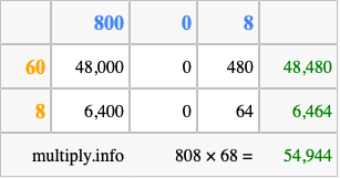 That's all there is to it! As you can see from the box above, the answer to 808 times 68 using the box method is 54,944.