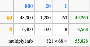 Finally, we add up all the sums we found in step 3 to get our final answer to 821 times 68.
