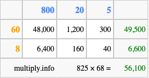 That's all there is to it! As you can see from the box above, the answer to 825 times 68 using the box method is 56,100.