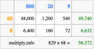 Below is an illustration showing you how to calculate 829 times 68 using the box method, using the instructions above.
