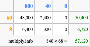 That's all there is to it! As you can see from the box above, the answer to 840 times 68 using the box method is 57,120.