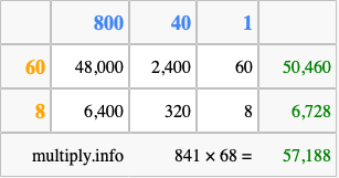 That's all there is to it! As you can see from the box above, the answer to 841 times 68 using the box method is 57,188.