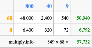 That's all there is to it! As you can see from the box above, the answer to 849 times 68 using the box method is 57,732.