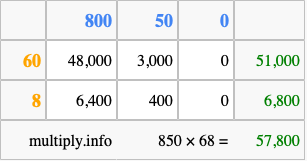 Below is an illustration showing you how to calculate 850 times 68 using the box method, using the instructions above.