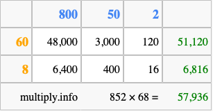 Finally, we add up all the sums we found in step 3 to get our final answer to 852 times 68.